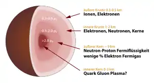 عن طريق معلوماتنا عن خواص الجسيمات المشتركة في تكوين النجم النيوتروني التي نعرفها من علم الجسيمات الأولية فيمكن تقسيم باطن نجم نيوتروني قطره 20 كيلومتر إلى الطبقات الآتية: