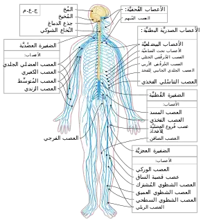 ![]() يربط النخاع الشوكي الدماغ والأعصاب في كل الجسم. النخاع الشوكي ظاهر باللون الأصفر | |