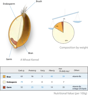 والنخالة غنية وخاصة في الألياف الغذائية والأحماض الدهنية الأساسية وتحتوي على كميات كبيرة من النشا، البروتينات، الفيتامينات والمعادن الغذائية.