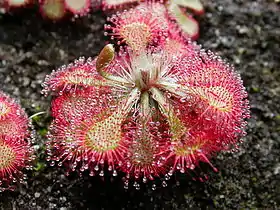 الندية (الاسم العلمي:Drosera) هي جنس من الندوية تتبع القبيلة من أسرة .[3] وهي أحد أكبر أجناس النباتات الآكلة للحوم، حيث لا تقل عن 194 نوعا. وأحد أعضاء فصيلة الدروسيرية. تصطاد الحشرات وتتغذى بها وتهضمها. وسمِيت بذلك الاسم لأنها تفرز قطرات من سائل لزج عن طريق الغدد الموجودة في أوراقها، وتشع هذه القطرات في ضوء الشمس كقطرات الندى. ويتواجد نبات الندية في المستنقعات في جميع أنحاء العالم. وتعتبر الندية ذات الأوراق الدائرية أكثر الأنواع انتشارًا وتنمو وتزهر في التربة الحِمضية الرطبة، في كل أجزاء شمال الكرة الأرضية باستثناء القارة القطبية الجنوبية. ويوجد في أستراليا أكثر من 55 نوعًا من نبات الندية معظمها ينمو في غربي أستراليا فقط. وتغطِّي قمة ساق الندية الرفيع أزهار صغيرة بيضاء. وتنمو عند قاعدة الساق مجموعة من الأوراق المسطحة الدائرية، وهي بحجم العملة المعدنية الصغيرة، ومغطاة بغُدد حمراء صغيرة بها شعيرات يمكن أن تلتصق بسهولة بقطرات السائل اللزج الموجود بالأوراق. وتلتف الشعيرات حول الحشرة، وتُمْسِك بها حيث يغمر السائل الحشرة فتختنق وتموت، ثم تفرز الغُدَد بعد ذلك عصارة تهضم الحشرة.
