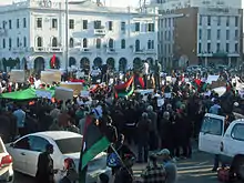مظاهرة في بنغازي تطالب بنزع السلاح عن المجموعات المسلحة المختلفة، وقد انتشر على نطاق واسع بعد ثورة 17 فبراير.