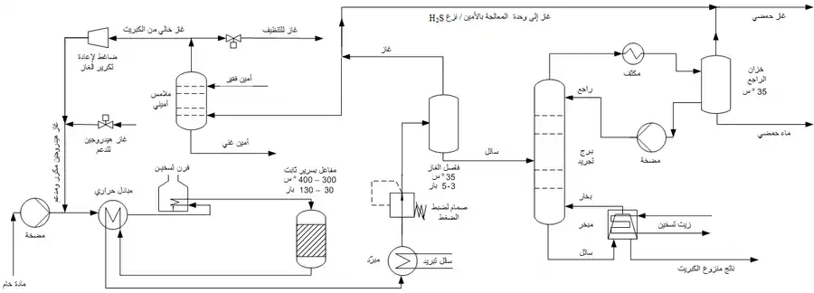 يظهر المخطط أدناه إحدى عمليات نزع الكبريت المهدرج المطبقة على المستوى الصناعي: