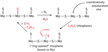 أظهرت الأبحاث أنه باستخدام مركب ثنائي كبريتيد الموليبدنوم كحفاز في عملية نزع الكبريت المهدرج فإن المنطقة الفعالة في التحفيز هي أطراف وجوانب سلسلة الحفاز، [12] في حين أن الدور الذي يقوم به جسم الحفاز هو كمركز لتثبيت المواقع غير المشبعة تساندياً coordinatively unsaturated site (CUS)، والتي تعرف أيضاً باسم الشاغر الأنيوني anion vacancy. فعلى سبيل المثال فإن مركبات مثل الثيوفين ترتبط إلى تلك المراكز عن طريق سلسلة من التفاعلات تفضي إلى انفصام الرابطة C-S وحدوث هدرجة للرابطة C=C. بالتالي فإن الهيدروجين هنا يقوم بأدوار عدة، فهو يولد شاغر أنيوني بإزالة الكبريتيد من الحفاز، ويقوم بهدرجة الروابط المضاعفة.