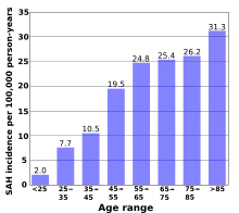 وفقا ً لمراجعة أجريت ل 51 دراسة من 21 دولة، متوسط حدوث نزيف تحت العنكبوتية هو9.1 لكل 100,000 سنويا. دراسات من اليابان وفنلندا تظهر معدلات أعلى في تلك البلدان (22.7 و 19.7 على التوالي)، وذلك لأسباب غير مفهومة تماما. في جنوب ووسط أمريكا، في المقابل، المعدل هو 4.2 لكل 100,000 في المتوسط.[59] على الرغم من أن المجموعة من الأشخاص المعرضين لخطر حدوث نزيف تحت العنكبوتية هي أصغر سنا من المجموعة السكانية المتضررة عادة بالسكتة الدماغية [3] فإن الخطر يستمر بالتزايد مع التقدم في السن. إن احتمالية إصابة الشباب بنزيف تحت العنكبوتية أقل من الناس في منتصف العمر (نسبة الخطر 0.1 أو 10%).[59] يستمر خطر الإصابة بالتزايد مع زيادة العمر ويبلغ نسبة 60% عند كبار السن (أكبر من 85 سنة) مقارنة مع الذين تتراوح أعمارهم ما بين 45 و55 سنة.[59] خطر الإصابة بنزيف تحت العنكبوتية أعلى بحوالي 25% لدى النساء في عمر 55 مقارنة مع الرجال في نفس الفئة العمرية، وربما يعكس هذا التغيرات الهرمونية التي تنتج عن انقطاع الطمث مثل انخفاض مستويات هرمون الاستروجين.[59] قد يكون للوراثيات دور في احتمالية إصابة الشخص بنزيف تحت العنكبوتية؛ يزداد الخطر بمقدار ثلاثة إلى خمسة أضعاف عند أقارب الدرجة الأولى لأشخاص سبق وعانوا من النزيف تحت العنكبوتية.[5] مع ذلك، إن العوامل الخاصة بأسلوب الحياة هي الأكثر أهمية في تحديد خطر الإصابة بشكل عام.[3] وهذه العوامل تشمل التدخين وارتفاع ضغط الدم والإفراط في استهلاك الكحول.[17] إذا كان الشخص مدخنا فيما مضى فإن ذلك يضاعف خطر إصابته بالنزيف مقارنة مع أولئك الذين لم يدخنوا من قبل قط.[3] تُمنح بعض الحماية الضئيلة للأفراد ذوي العرق القوقازي ومن قبل العلاج بالهرمونات البديلة وداء السكري.[3] من المحتمل وجود علاقة عكسية بين نسبة الكولسترول الكلي في الدم وخطر الإصابة بالنزيف تحت العنكبوتية الذي لم يحدث نتيجة للصدمة، لكن تأكيد هذا الارتباط يعوقه عدم وجود دراسات كافية.[60] حوالي 4% من حالات النزيف الأمدمي تحدث بعد الجماع و 10% من المصابين بالنزيف تظهر لديهم الأعراض عند الانحناء أو رفع الأشياء الثقيلة.[6] عموما، حوالي 1٪ من جميع الناس لديهم أم دم واحدة أو في الأوعية الدموية الدماغية. ولكن معظمها صغيرة ومن غير المرجح أن تتمزق.[32]