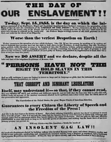 ![]() خريطة من العام 1856 تظهر ولايات العبودية (رمادي) والولايات الحرة (وردي) والمقاطعات (أخضر) في الولايات المتحدة، وتظهر مقاطعة كانساس في الوسط (أبيض) | |||||||