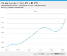 |CitationClass=تم تجاهله (مساعدة); تحقق من التاريخ في:|تاريخ الوصول=(مساعدة) - USA - Old-age dependency ratio (>64Y to 15-64Y) نسخة محفوظة 2014-11-17 على موقع واي باك مشين. [وصلة مكسورة]