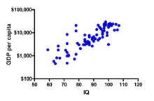 الأطروحة الأساسية في هذا الكتاب هي العلاقة بين متوسط نسبة الذكاء والناتج المحلي الإجمالي في 81 دولة، وهذا الرسم البياني بين العلاقة المباشرة بينهم