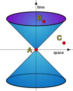 لكن هذه الحالة لا تنطبق في حالة الحدثين A وC (C يقع خارج المخوط الضوئي لـ A كما هو واضح) حيث توجد جمل مرجعية ترى حدوث A قبل C وجمل مرجعية ترى حدوث C قبل A. ولكن هذا بكل الأحوال لا يكسر قانون السببية لأنه يستحيل نقل المعلومات بين A وC أو بين C وA لأن هذا يستدعي سرعة أكبر من سرعة الضوء.