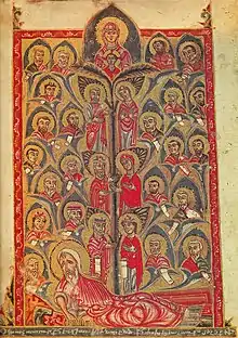 بن مليا؛ بن مينان؛ بن متاثا؛ بن ناثان؛ بن داود؛ بن يسى؛ بن عوبيد؛ بن بوعز؛ بن سلمون؛ بن نحشون؛ بن عميناداب؛ بن آرام؛ |