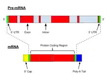 ما قبل الحمض النووي الريبي الرسول (mRNA)في كائنات حقيقيات النواة لها الإنترونات التي تقسمها spliceosomesالمتكونة من البروتينات النووية الصغيرة(small nuclear ribonucleoproteins).[9][10]