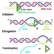 في حقيقيات النوى، ثلاثة أنواع من الحمض النووي الريبي RNA- الحمض النووي الريبي الرايبوسوم (rRNA) ، الحمض النووي الريبي الناقل(tRNA) ، والحمض النووي الريبي الرسول mRNA، يتم انتاجها من بوليمرات الحمض النووي الريبي الرنا بينما في بدائيات النوى فيوجد بوليمر واحد (سلسلة واحدة) الرنا لانتاج كل الأنواع الأخرى للرنا.[3] بوليميريز الحمض النووي الريبي (II) من حقيقيات النوى ينسخ إلى نسخة أولية، وهي نسخة مخصصة للمعالجة في الحمض النووي الريبي الرسول mRNA ، من قالب الحمض النووي المضاد للحساسية في اتجاه 5" إلى 3" ، وهذا النص الأساسي المركب حديثًا مكمل لجزء مضاد الحمض النووي للحمض النووي.[1] يبني RNA polymerase II النسخة الأولية باستخدام مجموعة من أربعة مخلفات أحادية الفوسفات ريبونوكلوسيد محددة ( أحادي فوسفات الأدينوساين (AMP) ، أحادي فوسفات سيتيني (CMP) ، أحادي فوسفات غوانوزين (GMP) ، يوريدين أحادي الفوسفات (UMP) 3 'مجموعة الهيدروكسيل في نهاية 3' من mRNA المتنامية.[1]