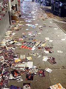 يتم توزيع المنشورات الورقية في الشوارع (وهي ممارسة تعرف باسم النشر )، وتوزع من الباب إلى الباب عن طريق البريد، وتلصق/ تنشر على لوحات الإعلانات، وتوضع على أطراف الزجاج الأمامي في السيارات، وتقدم في المناسبات، أو تلصق على أعمدة الهواتف والجدران، أو غيرها من الأسطح.