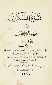 نشوة السكران من صهباء تذكار الغزلان، هو كتاب من تأليف أبي الطيب محمد صديق خان بن حسن بن علي بن لطف الله الحُسيني البُخاري القنوجي (1248 - 1307هـ/ 1832 - 1890م)، وهو كتاب يندرج في الكتب التي ألفت في العشق والغرام والحب والهيام، وهو بيان للعشق والعشاق والمعشوقات من النسوان، وما يتصل بذلك من تطورات الصبوة والهيمان، وذكر آراء القدماء والحكماء في العشق ومنهم فيثاغورس وأفلاطون وأرسطو وابن سينا وغيرهم، وذكر آراء الصوفية ومنهم الجنيد البغدادي، ثم تطرق إلى آفات القلب وتعلقهِ بالمحبوبات وروى قصصاً مأثورة في التراث العربي عن العشق والحب العذري وما آل إليه العشاق في تصرفاتهم وأحوالهم وأنواع النساء وبيان لأصنافهم وتفضيلاتهم وغيرها من نوادر العرب ونوادر أهل الهند في العشق والغرام، فيذكر قول بعض الفلاسفة في العشق: (لم أر حقا أشبه بباطل ولا باطلا أشبه بحق من العشق، هزله جد، وجده هزل، أوله لعب، وآخره عطب).[1] [2]