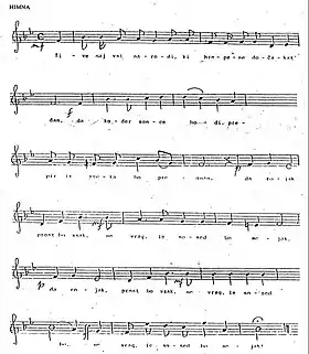 كُتبت جميع أو جزء من كلمات النشيد في القرن التاسع عشر من قِبل شاعر فرنسي، ولُحنت الألحان في عام 1905 من قِبل المُلحن السلوفيني ستانكو بريمرل.