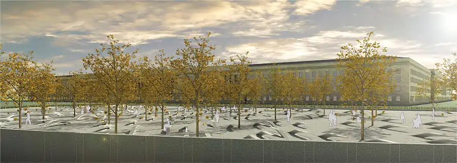 نصب البنتاغون التذكاري النصب التذكاري في البنتاغون، ويقع في جزء الجنوب الغربي من وزارة الدفاع الأمريكية في مقاطعة أرلينغتون بولاية فيرجينيا، هو نصب تذكاري في الهواء الطلق الدائم يخلد ذكرى 184 شخصا قضوا نحبهم في هجوم على مبنى البنتاغون و ركاب الخطوط الجوية الأمريكية الرحلة 77 خلال هجمات 11 سبتمبر.[1]