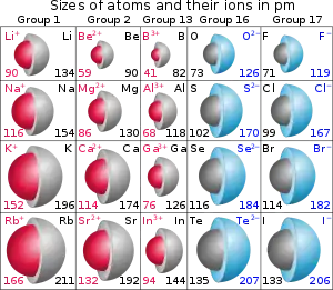 يمكن أن تكون الأيونات أكبر أو أصغر من الذرات المعتدلة، وذلك حسب شحنة الأيون. عندما تفقد الذرة إلكترون ما من مدارها الخارجي لتشكّل كاتيون، فإن الإلكترون المفقود لم يعد يساهم في وقاية الإلكترونات الأخرى من تأثير شحنة النواة، وبالتالي، فإن الإلكترونات الأخرى تنجذب بقوة أكبر إلى النواة، مما يجعل نصف قطر النواة أصغر. بالمقابل، فإنه عند إضافة إلكترون إلى النواة وتشكيل أنيون فإن الإلكترون المضاف يقلل من تأثير الحجب المذكور، مما يؤدي إلى زيادة نصف قطر النواة.