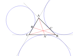 في أي مثلث المسافة على المحيط بين رأس في المثلث ونقطة على الضلع المقابل لهذا الرأس التي تمس فيها دائرة خارجية المثلث تساوي نصف محيط المثلث.