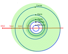 حيث : AU : وحدة فلكية = نحو 150 مليون كيلومتر (= بعد الأرض عن الشمس).