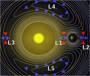 في المثال إلى اليسار، يمتد نطاق هيل الكروي بين النقطتين اللاغرانجيتين L1 و L2، اللتان تقعا على الخط الواصل بين مركزي الجسمين. وتكون منطقة نفوذ الجسم الثاني (الشمس) أقصر في اتجاه هذا الخط، ويكون هذا عامل محدد لمدي نطاق هيل للشمس. فأى جسم ثالث يدور حول الثاني (مثل قمرٍ يدور حول كوكب المشتري) بعد تلك المسافة، يقضى على الأقل جزءاً من مداره خارج نطاق هيل، وسيتعرض تدريجياً لاضطرابات ناتجه عن قوى المد والجزر للجسم المركزي (مثل الشمس)، حتي ينتهى به المطاف بأن يدور حوله.