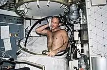رائد فضاء يستحم في المحطة الفضائية سكاي لاب التي تدور حول الأرض. تنشر ستائر الحمام من الأرض وتربط مع السقف. يأتي الماء بعد ضغط الزر من فوق الرأس. يصرف الماء باستخدام نظام تفريغ.