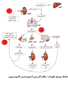 | لفهم المخطط نبدأ من الكلية: يؤدي انخفاض حجم الدم الوارد إلى الكلية إلى إفراز الرينين، وبعد سلسلة تفاعلات نحصل على الأنجيوتنسين II. تأثيرات الأنجيوتنسين: