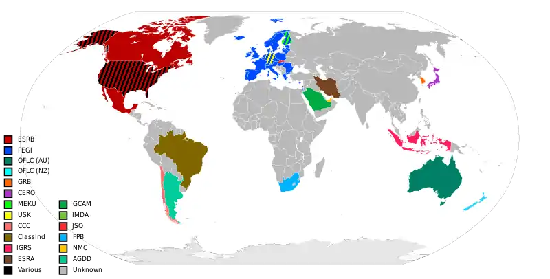 توضيح لأماكن استخدام تقاييم الألعاب المختلفة حول العالم . الدول باللون الرمادي تستخدم أكثر من نظام تقييم .