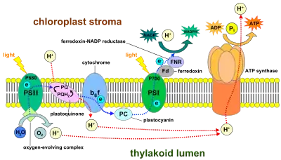 يتم استخدام الطاقة هذه (العملية بِكاملها تسمى التناضح الكيميائي)، لنقل الهيدروجين (H +) عبر الغشاء إلى تجويف الثايلاكويد، لتوفير فرق محتمل في الطاقة بين مساحة تجويف الثايلاكويد والستروما (سدى)[5] البلاستيدات الخضراء، الذي يصل إلى قوة البروتون الدافع التي يمكن استخدامها لتوليد ATP. يتم نقل البروتونات بواسطة البلاستوكينون.إذا مرت الإلكترونات مرة واحدة فقط، فإن العملية تسمى الفسفرة الضوئية غير الدورية (non-cyclic).