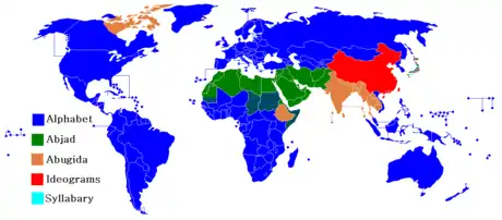 - ألفبائية: فيه يكتب الحرف ثمَّ يحرك بواسطة أحد حروف المد، مثل الألفبائية اللاتينية.