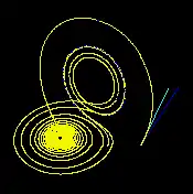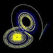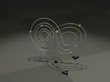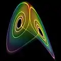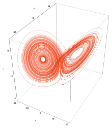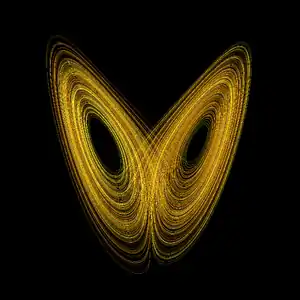 تأثير الفراشة الزمن t=1 (تكبير) الزمن t=2 (تكبير) الزمن t=3 (Enlarge) تم إنتاج هذه الرسومات باستخدام قيم ρ=28, σ = 10 و β = 8/3 — تظهر ثلاث أقسام للدوران الثلاثي الأبعاد لمسار ثنائي الأبعاد (أحدهما بالأزرق والآخر بالأصفر) في جاذب لورينتز مبتدأً عند نقطتين يختلفان عن بعضهما بمقدار 10-5 على محور السينات.