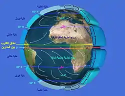 يصل المزيد من الطاقة إلى المناطق المدارية أكثر من المناطق القطبية، ويؤدي فرق درجة الحرارة اللاحق إلى تحريك الدوران العالمي للغلاف الجوي والمحيطات.[21] يرتفع الهواء عندما يسخن، ويتدفق في القطبين ويغرق مرة أخرى عندما يبرد، ويعود إلى خط الاستواء. بسبب الحفاظ على الزخم الزاوي، يحول دوران الأرض الهواء إلى اليمين في النصف الشمالي من الكرة الأرضية وإلى اليسار في النصف الجنوبي من الكرة الأرضية، وبالتالي تشكيل خلايا جوية مميزة.[22] وتتكون الرياح الموسمية والتغيرات الموسمية في الرياح وهطول الأمطار التي تحدث في الغالب في المناطق الاستوائية،[23] بسبب حقيقة أن الكتل الأرضية ترتفع بسهولة أكبر من المحيط. يؤدي اختلاف درجة الحرارة إلى اختلاف الضغط بين اليابسة والمحيطات مما يؤدي إلى رياح ثابتة.[24]