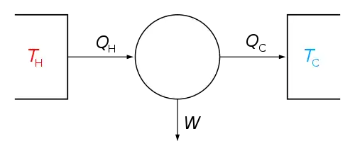 في هذا الشكل يظهر "وسيط الشغل " الذي قد يكون بخارا أو سائلا يمكن تسخينه بحرارة QH فيُنتج شغلا ميكانيكيا W. في عام 1824 افترض سادي كارنو في رسالته " أفكار حول القوة الحركية للنار" أن يكون الوسط أي مادة قابلة للتمدد مثل بخار الماء أو بخار الكحول أو بخار الزئبق أو غاز أو الهواء وغيرها. ومع أنه في ذلك العصر ظهرت عدة آلات متغيرة التصميم، إلا أنها كانت جميعها تحتوي على غلاية، يتم فيها تسخين الماء QH حتى الغليان بواسطة فرن، وكان QC ماء بارد يسيل في مكثف موضوع على الآلة. وكان الشغل الناتج W عبارة عن حركة مكبس الذي يُدير محورا، فيمكن بذلك إدارة قرصا أو بكرة تعمل على رفع المياه من المناجم. وقام كارنو آنذاك بتعريف الشغل بأنه " رفع ثقل إلى ارتفاع معين".