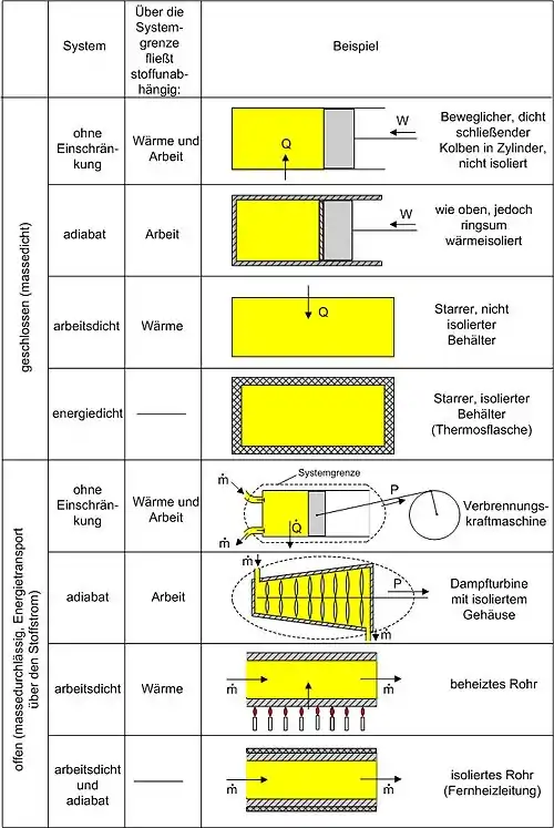 في حالة النظام المغلق نهتم بدراسة تغيرات الطاقة و الحرارة والشغل التي تخرج من حدود النظام، وتغير بذلك الطاقة الداخلية وحالة النظام. وفي حالة النظام المعزول لا يوجد تبادل من أي نوع مع الوسط المحيط ؛ أي أن الطاقة الكلية للنظام تبقى ثابتة لا تتغير.