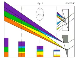 ![]() طيف ضوئي، من نظرية الألوان، لاحظ غوته أن الألوان تظهر عند الحواف وأن الأطياف تنشأ عندما تتداخل هذه الحواف الملونة. | |