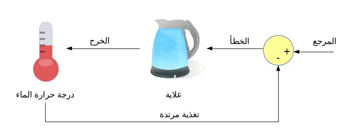 في هذه الحالة فإن المدخلات للمتحكم (الغلاية) هي الفرق بين القيمة الراجعة وقيمة التغذية المرتدة، وهو ما يسمى بالخطأ. والمخرجات هنا هي عمل الغلاية (تسخين أو عدم تسخين) ويعتمد على قيمة الخطأ ونوع المتحكم. ودرجة حرارة الماء هو المتغير الذي يتم التحكم فيه ويتم قياسه من خلال وصلة التغذية المرتدة.