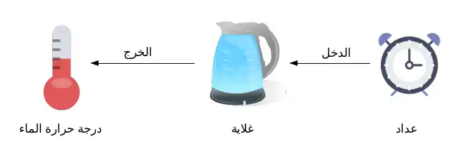 في هذا النظام يكون المتحكم هو الغلاية، ومدخلات النظام هي قيمة العداد الزمني. أما المخرجات فهي الفعل (تسخين أو عدم التسخين). ودرجة حرارة الماء هي المتغير الذي يتم التحكم فيه.