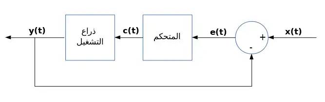 نلاحظ أنه تم تقسيم الغلاية إلى مكونين: المتحكم controller ومخرجه c دالة رياضية تعبر عن تشغيل المسخن heater أو إيقافه. أما ذراع التشغيل (بالإنجليزية: actuator) فهو يمثل المسخن heater نفسه. ويعمل ذراع التشغيل حسب خرج المتحكم، ويؤثر مباشرة في متغير الخرج y، والذي يمثل في هذه الحالة درجة حرارة المياه. أما المتغير x فهو يمثل درجة الحرارة التي نرغب في الوصول إليها (set point). والفرق بين x وy هو ما يسمى بالخطأ e وهو ما يؤثر على عمل المتحكم. في أنظمة أخرى ممكن أن يكون مثلا ذراع التشغيل هو ذراع يتحكم في محبس valve، ويعبر y وx عن تدفق المياه من خلال المحبس. ويقوم المتحكم بتحريك ذراع التشغيل لأعلى ولأسفل حسب إشارة الخطأ e، وعندها تمثل c مثلا قيمة القوة المؤثرة أو العزم المؤثر على الذراع، ويقوم بإيقاف حركة الذراع (بوضع c مساوية للصفر) إذا اقترب الخطأ من الصفر. نلاحظ أيضاً أن المتغيرات في الرسم كلها تعتمد على الزمن t.