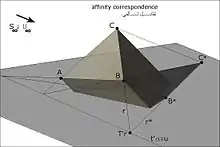 عند التحقق من وجود علاقة إسقاطية بين العناصر المتورطة في إيجاد الظل، يمكن تحديد العلاقة بين الكائن وظله. العلاقة بين شكل مسطح ∆ وظلة ∆* تعتبر تقابل تألفي (أو افّيني) عندما يكون مصدر الضوء نقطة لانهائية، حيث محور التقابل هو خط التقاطع بين مستوى الشكل ∆ والمستوى الذي يتلقى الظل، ومركز التقابل هو مصدر الضوء نفسه. بينما إذا كان المصدر نقط نهائية، لا تتغير عناصر التقابل التي هي المحور u والمركز U, ولكن التناظر يسمى تقابل منظوري. بمجرد الانتهاء من تحديد متطلبات التقابل : المركز U والمحور u ونقطتين متقابلتين (أو خطين متناظرين)، يمكن المضي قدما لتحديد نقاط ظل أخرى من خلال استغلال خاصية التقابل، التي تكمن في اصطفاف النقاط المتناظرة مع المركز U وفي تقابل الخطوط المتقابلة على طول المحور u. على سبيل المثال، بمجرد إيجاد نقطتين متقابلتين مثل A* و A (الشكل --)، يمكن تحديد الظل B*: (للنقطة B) بتوصيل النقطتين A و B بواسطة الخط r، الذي يلتقي المحور u في النقطة t'α. والتي بتوصيلها A* نجد الخط r* (ظل الخط r)، الذي يتقاطع في النقطة B* (نقطة الظل المطلوبة) مع شعاع الضوء المار بالنقطة B.