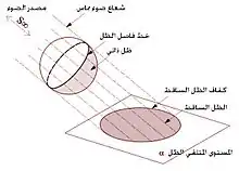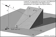 - ظل نقطة P على سطح ∆ يمكن تحديده كنقطة تقاطع بين الشعاع الضوئي المار بالنقطة P مع السطح المتلقي الظل ∆