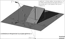 - - نجد نقطة التقاطع R بين الآثار الأولى (t'α و t'λ) للمستويات α وλ. النقطة R تمثل ظل نقط ثانية للخط r على المستوى α. لذلك نجد r* (ظل الخط r على α), بتوصيل النقطتين P* و R. وأخيراً, نجد Q* (ظل الطرف الأخر للخط r) كنقطة تقاطع بين r* وشعاع الضوء المار بالنقطة Q