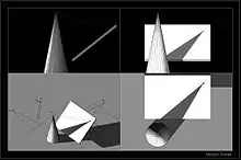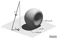- ظل خط منحنى κ على سطح مستو α، يتوافق مع تقاطع بين اسطوانه ضوئية والسطح α. سطح الاسطوانه تتكون من أشعة الضوء وقاعدته تتطابق مع نفس المنحنى κ.