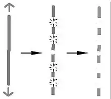 ثم إذا سحبناه من الطرفين لتعديله، فإن الخط سيُقوم أولاً، وبعد ذلك سينكسر إلى قطع صغيرة مصطفة على نفس الاستقامة. بهذا أنشئنا خط فركتلي ببعد فركتلي أقل من واحد (أي، خط مثقوب هو، رياضياياً, أقرب إلى مجموعة من النقطة التي بعدها == صفر بالنسبة لخط متواصل طولة == واحد).