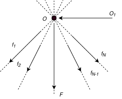 فكر في مجموعة من متجهات القوة التي تتفق في نقطة ما في الفضاء. تكون محصلتها :