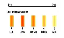 | LDH5 | MMMM | في العَضلات الهيكلية والكَبِد | 6-16% | يَرتفع في حالات أمرض الكبد والعضلات المخططة. |