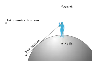 رسم بياني يوضح العلاقة بين النظير وسمت الرأس وأنواع مختلفة من الآفاق. لاحظ أن النظير هو عكس سمت الرأس.