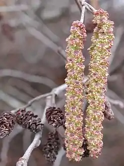 ![]() الأزهار الذكرية للنغت المنشاري (إلى اليمين) والأزهار الأنثوية الناضجة (إلى اليسار) الأزهار الذكرية للنغت المنشاري (إلى اليمين) والأزهار الأنثوية الناضجة (إلى اليسار) | |
