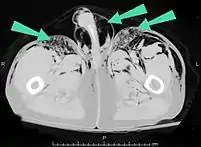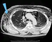 ![]() مقطع عرضي للبطن بالأشعة المقطعية لمريض مُصاب بنفاخ تحت الجلد (مشارًا إليها بالأسهم) مقطع عرضي للبطن بالأشعة المقطعية لمريض مُصاب بنفاخ تحت الجلد (مشارًا إليها بالأسهم) | |
