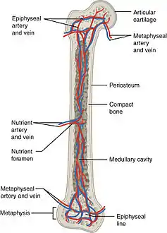 ![]() إمداد الدم إلى العظام الطويلة. و يظهر في الرسم الشرايين المغذية ، و الأوردة والثقبة المغذية. | |