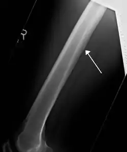 ![]() صورة الأشعة السينية تبين النفق المغذي للعظم في عظم الفخذ مُشار إليه بالسهم الأبيض. صورة الأشعة السينية تبين النفق المغذي للعظم في عظم الفخذ مُشار إليه بالسهم الأبيض. | |