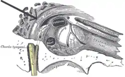 ![]() View of the inner wall of the غشاء طبلي. (Facial canal visible in upper left.) View of the inner wall of the غشاء طبلي. (Facial canal visible in upper left.) | |