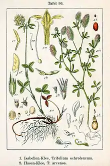 ![]() رسم توضيحي مقارن لنبات النفل الكبريتي (إلى اليسار) مع النفل البري رسم توضيحي مقارن لنبات النفل الكبريتي (إلى اليسار) مع النفل البري | |
